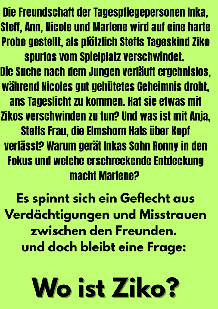 Ja, es wir einen neuen geben, voraussichtlich im kommenden Frühjahr. Und was soll ich sagen? Er spielt wieder mit unseren schlimmsten Ängsten: Verlust und Machtlosigkeit. Und diesmal geht es um ein verschwundenes Kind. Da ich im realen Leben zur Zeit als Tagesmutter arbeite, ist mir die Idee gekommen, als ich mit einigen Kollegen*innen auf eben dem Spielplatz stand und wir kurz ein Kind nicht im Blick hatten. Das war ein Riesenschreck, wir haben dieses Kind jedoch nach einigen Sekunden entdeckt. Dennoch war uns unser Herz in die Hose gerutscht. Wie schnell kann so etwas bitte passieren, fragte ich mich und sponn den Gedanken weiter …